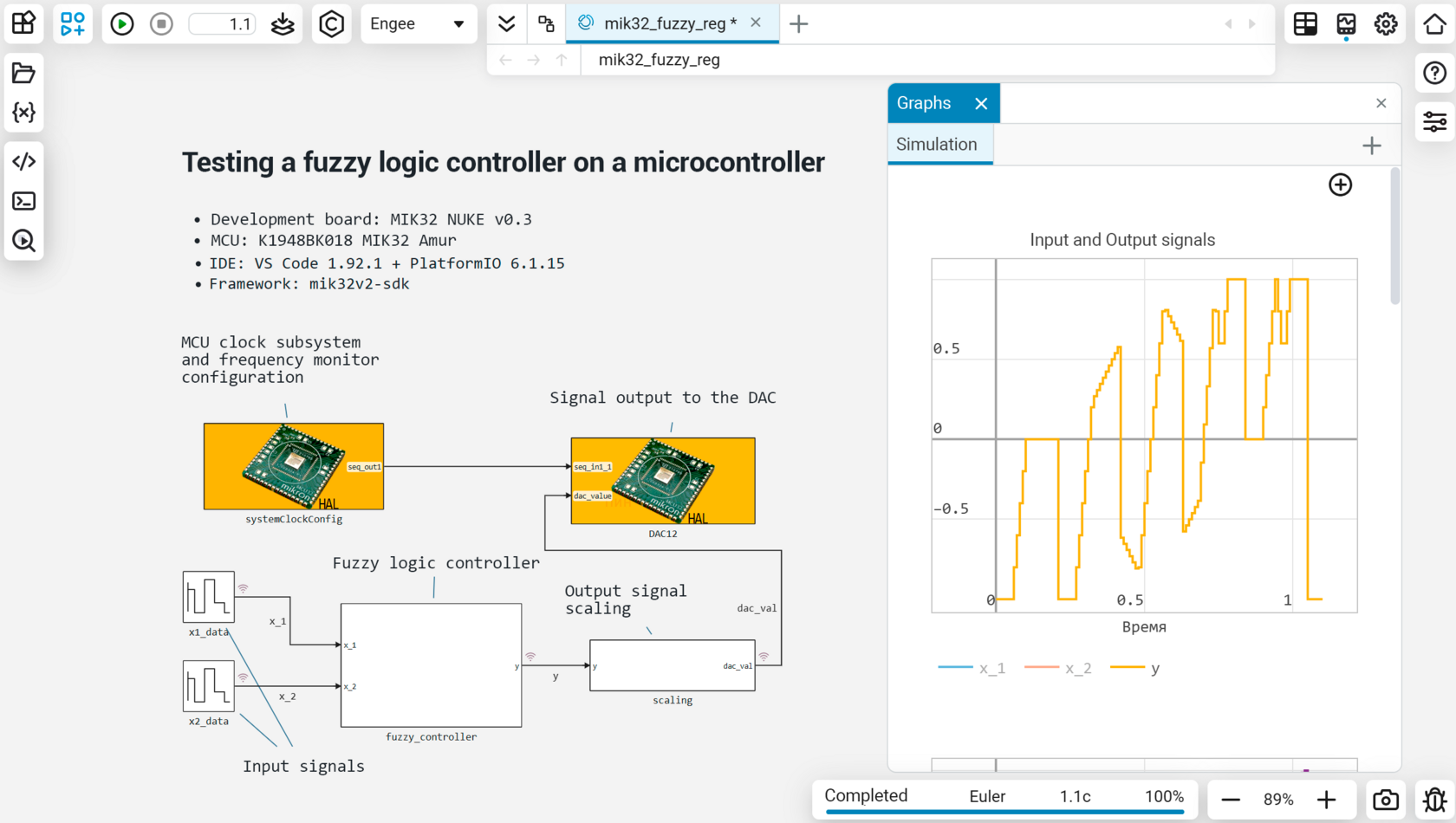 Engee is a foundation for model-based design of complex technical systems. It enables engineers to use familiar graphical block diagrams to simulate before hardware implementation, and to deploy algorithms without hand coding. The environment provides a functional and modern model editor, efficient debugging tools, and rich library of enginners-useful blocks for wide range of tecnical applications.